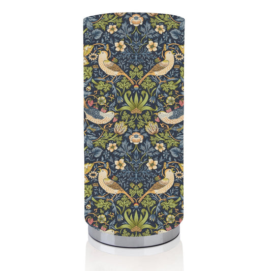 William Morris Strawberry Thief Navy Pad Lamp / nightlite Each lamp is hand made and has a rolled edge for a clean finish. comes with a chrome colour base.Pad Lamp/Nightlite: Dimensions : approx Height 11" x width - 5" Bulb - E14 ses 25w bulb (not included)The photo's appear differently...